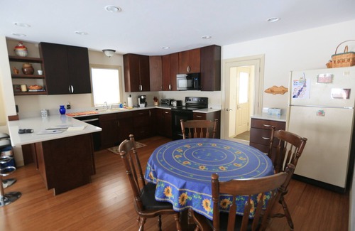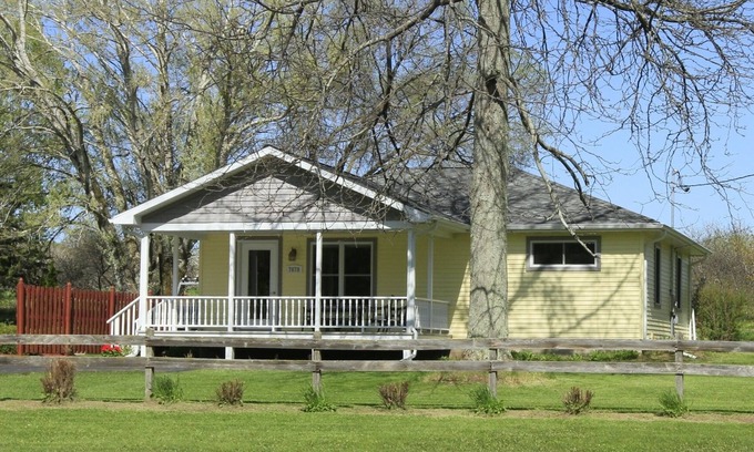 Perfect location with updated amenities 2024. This is a perfect spot for a family, or 4 gals going shopping, 4 guys going golfing, or 2 couples sharing a vacation in Door County. Two comfortable bedrooms have attached bathrooms with beautifully tiled showers, accessible from your bedroom or the hallway. Our bedrooms offer updated king beds or can be configured into twins if that better meets your needs. Enjoy cable TV or a movie from your bed. The kitchen is beautiful and spacious so you can cook in - or cook out on the grill. It is well stocked with cookware and appliances so you can enjoy fixing a meal in your home away from home. It's an easy walk to Main St Market, downtown shopping and restaurants. Sharing coffee or an afternoon refreshment on the front porch is about as pleasant as it gets. The living room is light and airy combining with the kitchen to make a spacious great room for your group. Pull up a stool to the counter and plug in your computer - the house is equipped with WIFI. Washer and dryer downstairs are also available for your use. The yard is big and pleasant, adjoining a former cherry orchard. Enjoy an evening around the fire pit! You can walk to the Marina from here, or to the beautiful Egg Harbor beach, and enjoy the free concerts at the park on Sunday afternoon's. No need for a car while in Egg Harbor at the Yellow House. .
