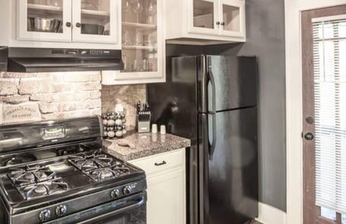 Enjoy this bright, airy escape with custom granite countertops, as well as brand new, stylish furnishings and everything needed for your stay! This third floor unit has keyless entry, and guests may enjoy the shared fenced lawn and patio w/ grill, fire pit and dining area. A great place for pets, string lights turn on automatically each evening, creating a city oasis. We're minutes from downtown, the SOBO district, Cherry Street, the Gathering Place, Brookside and more!