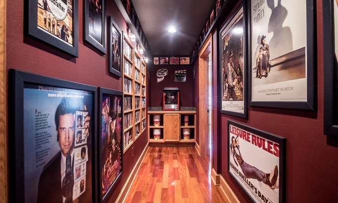 Oversize theater room with custom movie themed posters and popcorn maker. State of the art theater equipment and seating.