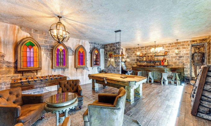 - Custom pool & foosball tables, lounge area w/ large-screen TV, massive medieval bar
