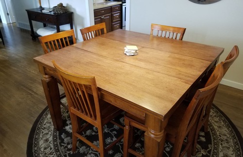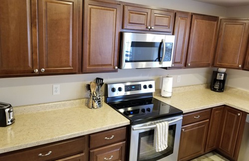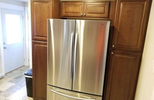 The Kitchen is very well equipped to make and enjoy all your favorite meals. Stainless steal full size stove/oven, over the stove microwave, very quite dishwasher, and a large french door refrigerator with ice maker all made by Samsung. We have coffee maker, crock-pot, blender, Dishes, silverware, cooking utensils and much more. Enjoy all those wonderful meals inside on the Dinning room table with eight chairs or outside on the deck and Patio.