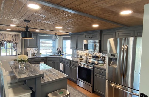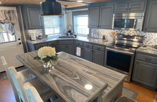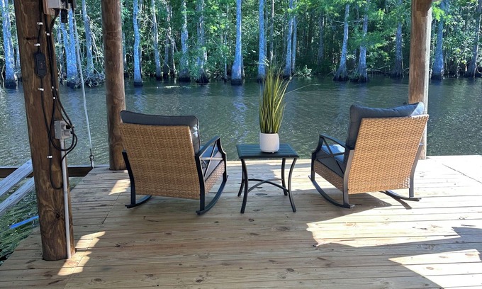 Connected to the back deck is a covered deck that extends 30’ over the water and has 2 -3500 lb boat lifts and a fish cleaning station. Guests are welcome to bring their own water craft and can be kept in the boat house for the duration of their stay. There is a convenient boat launch at the front of the neighborhood for you to launch upon arrival. Lift planks can be adapted for different types of boats if needed. Boat house also includes power for charging and outdoor lighting.