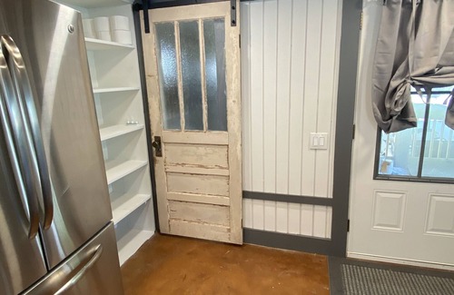 Upon entry, guest will be standing at the start of the full kitchen with all modern amenities including all stainless appliances, (French door refrigerator, microwave, and range with oven) garbage disposal, granite sink, porcelain counter tops, center island with breakfast bar for 3 and all kitchen set up items needed for your stay. At the rear of the kitchen, just to the right of the entry is the full bath. The barn style door offering access and privacy to the full bath was pulled from an antebellum home on river road in Reserve, LA and re-purposed specifically for this property.