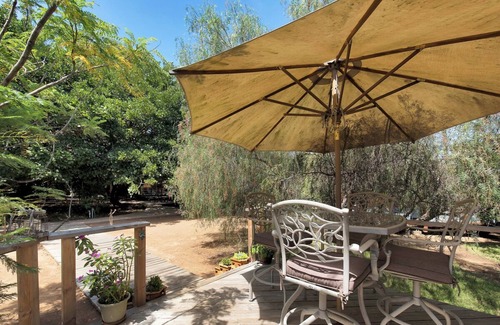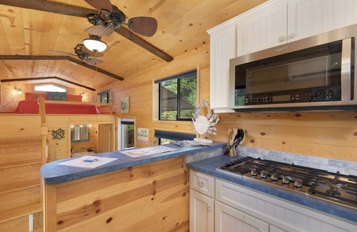 Coral Tree House's Tiny Beach House is 280 square feet spread out over 3 levels. Level 1 is the communal living space with a couch that is actually a recessed queen size bed, large screen TV and full bath. Level 2 is the kitchen with stove top, convection microwave, fridge, toaster and sink for washing up. Level 3 is the loft bedroom with queen size bed. Full access to the beautiful property, pool and jacuzzi, and breakfast are included with your stay. Close to Old Towne Temecula, Wine Country, Pala and Pechanga Casinos, Golf