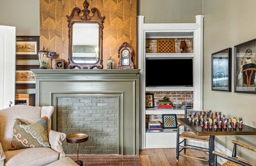 The formal dining room comfortably seats 8-10 guests. Local designer, Julie Williams, captures and pays tribute to the traditional style of the home while balancing the perfect mix of contemporary flare. Enjoy a savory dinner and cocktail while falling in love with the youthful and classic wallpaper by Ferrick Mason. Local chefs specializing in local cuisine and farm to table fare are available to cater upon request at an additional cost.