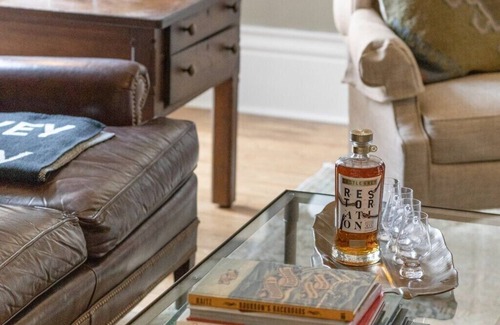 Upon entry, guests will be warmly embraced by a mix of old and new. The journey begins as soon as you enter the foyer where the home's keeping room awaits. Guests can enjoy a curated cocktail on the leather chesterfield sofa after a long day, read a book while overlooking the Hickory King corn fields cultivated for the distillery, or simply play a game of chess. One detail that should not be overlooked in this room is the tobacco leaf wallpaper above the mantel from local artisan, Alex Mason and her company Feerick Mason.