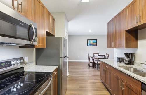 Fully-equipped kitchen with countertops and ample cabinet space.