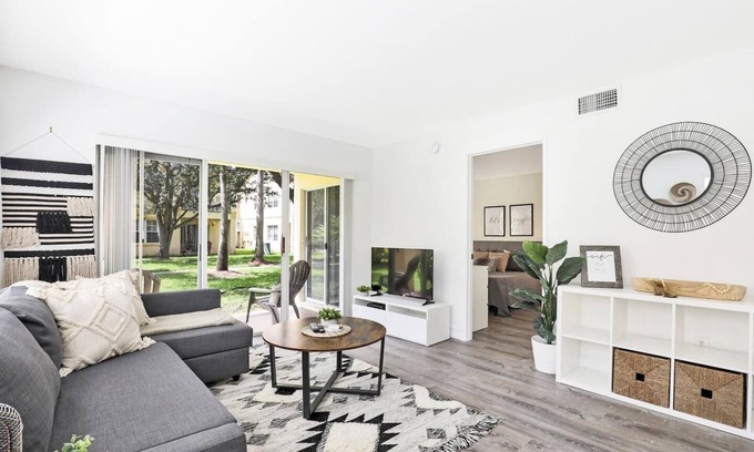 Stay in our modern bohemian 2-bed, 2-bath apartment with in-unit washer/dryer in quiet West Boca Raton. Close to shops, eateries, gym, coffee shop, and cinema. Walk to Evert Tennis Academy & Boca Prep International School, drive 5 mins to West Boca Medical. Free parking. King & queen beds, sleeper couch, desks, lake views, saltwater pool access. 15-min drive to Town Center Mall, under 30 mins to Boca beaches.