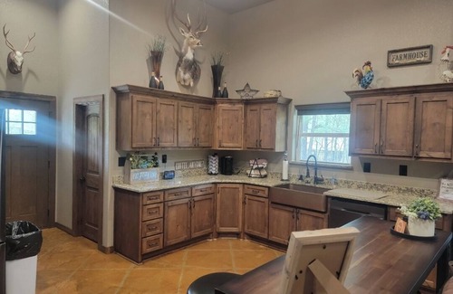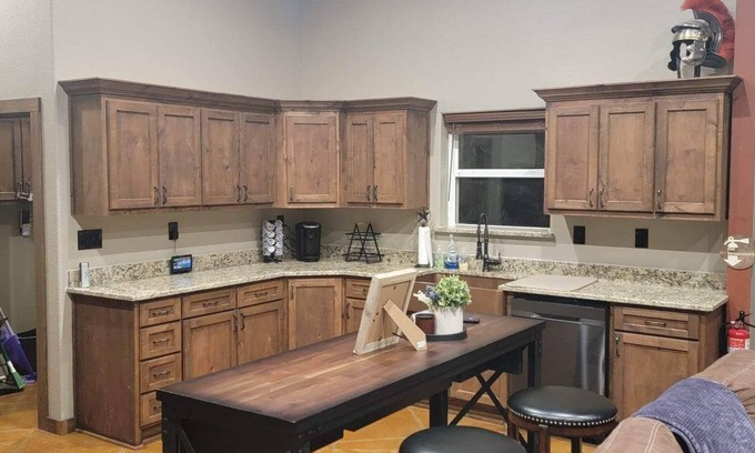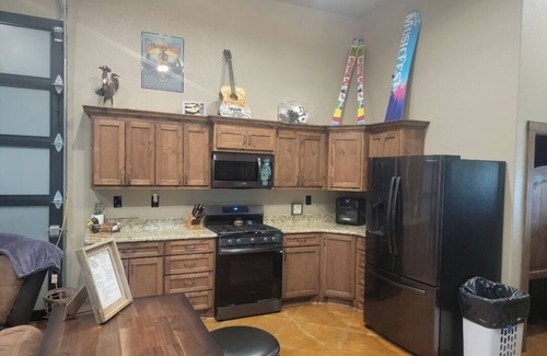 This rustic bardominium has 2 bedrooms and 2 bathrooms. It has an office with a daybed that pulls out into a king. There is ample onsite parking in addition to lake access via a private boat ramp. There is a full kitchen and laundry room. This barndo is unique in that it has unique features like a Texas shaped sink and memorabilia from our travels. There is a refreshing wrap around porch with chairs where you can enjoy your morning coffee. This property also has a garage door to the porch you can open on the cooler days.