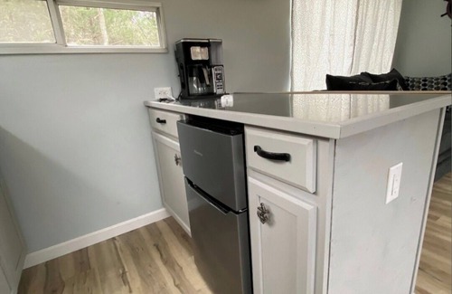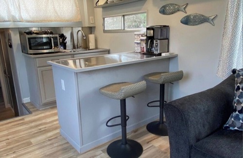 The living room has a loveseat couch and massage chair for our weary travelers to relax to the fullest. A stocked kitchenette allows for light meal preps while you relax. There is not a full stove but we provide an electric double burner & hot plate to cook with while you are here. Microwave, coffee pot and utensils are all stocked and ready for use.