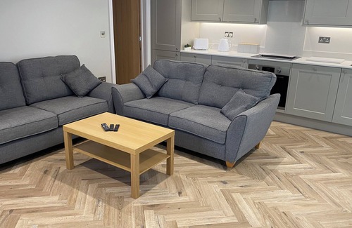 The Kitchen/Dining/Living consists of 2 sofas, smart TV with sound system, Dining Table for 2/4, and a fully fitted kitchen with integrated appliances and quartz worktops.