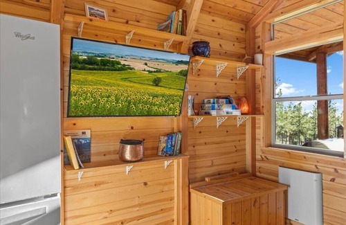 This tiny house is located just 25-30 minutes South of Missoula up a quiet private road in Florence, MT. Enjoy views of the Bitterroot Mountains while you sip coffee from the porch or grill on the Traeger. This cabin is on a 10-acre semi wooded and completely private lot with no views of neighbors. Enjoy a private, romantic and inspiring stay in our cabin with free Wifi. There is a queen-sized bed in a sleeping loft. The couch also pulls out to a queen-sized bed to accommodate four people.