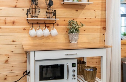 Travel down country roads where you will find our little cabin. Guests will travel up a gravel drive where our cabin overlooks farmland, perfect for sunrises and coffee. You will be greeted by a large, covered porch where you can sit and relax. Upon entering, you are welcomed to an open concept living room/kitchen. Our kitchen is fully stocked with all the basics and guests have access to our queen-sized sleeper sofa.