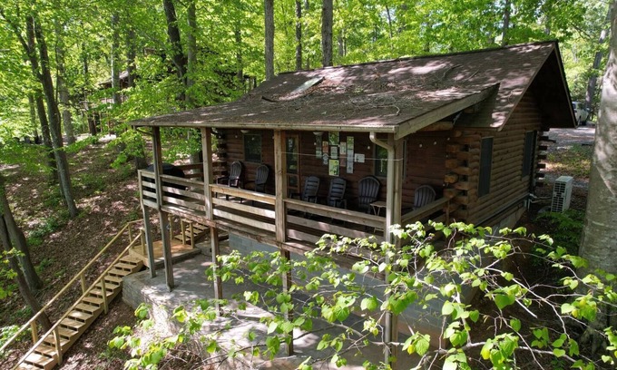 Enjoy the sun rising over the Blackwater of Smith Mountain Lake from the spacious covered porch and then spend the day playing on the water. Finish off a perfect day at the lake by sitting around the campfire. The lake front Cabin at Pine Haven has expansive views from a bluff above the water. Ask about adding Kayak Rentals to your stay.