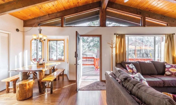 This incredibly quaint cabin is perfect for a couples retreat or a family vacation during any season. We are located in Sugarloaf, CA a community in the Big Bear Valley. The cabin features modern upgrades, open floor plan for the common spaces, large windows, and vaulted beam ceilings to bring nature indoors. Sit back and enjoy the mountain scenery and chirping birds on the large deck or throw a log in the stone fireplace. We welcome dogs, see pet policy below.