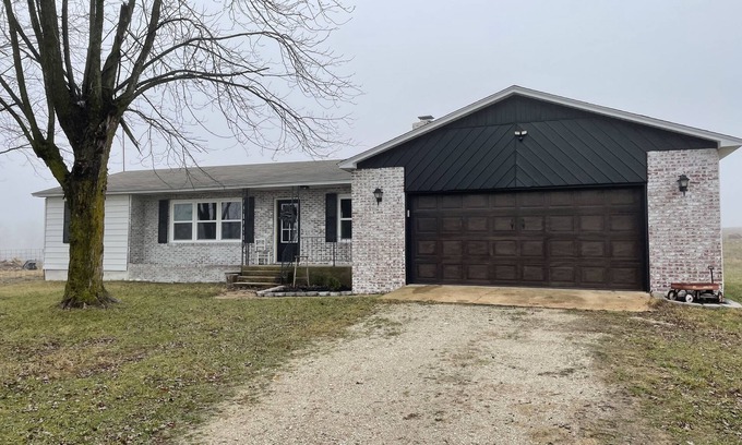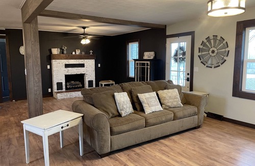 This country charm farmhouse is located just 3 miles from Walmart in Mtn. Grove. The home features 2 bedrooms with 1 & 1/2 bathrooms. Master bedroom is equipped with a half bath & queen size bed. Second bedroom has a full size bed. Full bathroom has a tub/shower combo. Open concept living area features a fully equipped kitchen/dining area & living room with flat screen tv & pull out couch to provide additional sleeping space. Back patio overlooks farmland & occasional livestock.