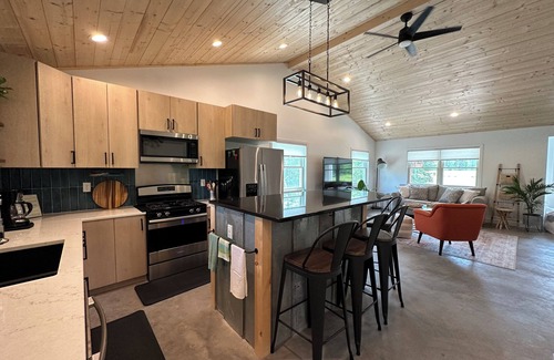 Lenawee Getaway has a modern kitchen with gas range & oven, refrigerator with filtered water & ice, dish washer, microwave, coffee maker, blender, and an additional beverage refrigerator for extra storage. The large bar height center island with seating for six is the perfect place to gather with friends and family while you enjoy a meal, play games, or solve the world’s problems. A smaller bistro table and chairs is also provided for additional dining space.