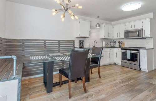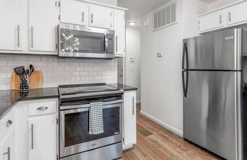 Fully furnished, private parking, premium internet, electric, gas, utilities, 2 TVs , living room chair, sofa and loveseat, restaurants within 1 block, queen bed and 2 full beds with premium bedding and mattress, dinning area, new central heat and air, washer and dryer, premium coffee maker, overlooking pond etc.. Driveway parking available. 4 cars Max. NO STREET parking