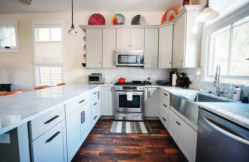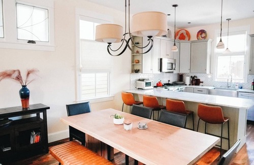 This recently built house has reclaimed wood floors and many designer touches. Sleeps 6 (or 8 comfortably with the pull out sofa) and includes several air mattresses and a pack-n-play for extra babies or toddlers. Your pup will be right at home with a memory foam doggie bed and a fenced in back yard. The kitchen is fully stocked with spices and oils and every kitchen gadget (even an instapot) so leave everything at home and unwind in the perfect vacation spot.