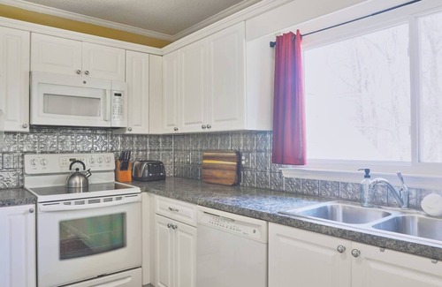-Fully stocked kitchen with all the necessary items for cooking, crock pot and airfryer, full blender and single-serve cup blender.