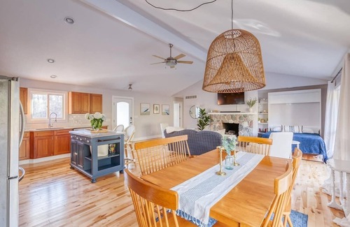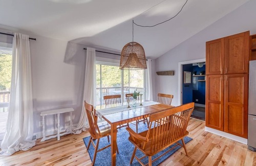 The dining room sits in between the living room and kitchen and looks out over the back porch and expansive backyard. Six people can sit here comfortably, and the sunny spot is also perfect for board games, card games, or setting up laptops to plan the day’s adventure.