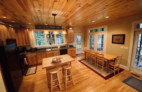 As you enter Little Lakemont through the front door (via the screened-in, wrap-around porch), you’re welcomed immediately by the open kitchen and dining area that overlook the family room. Cook (or simply eat) to your heart’s content with all the pots, pans, plates and utensils one could need. The kitchen features a gas-burning oven and stove, microwave, toaster oven, drip coffee machine, Keurig, dishwasher, garbage disposal and refrigerator with ice machine. We also have an ice-cream machine, slow-cooker, popcorn machine, shaved ice machine, blender and hand-mixer.