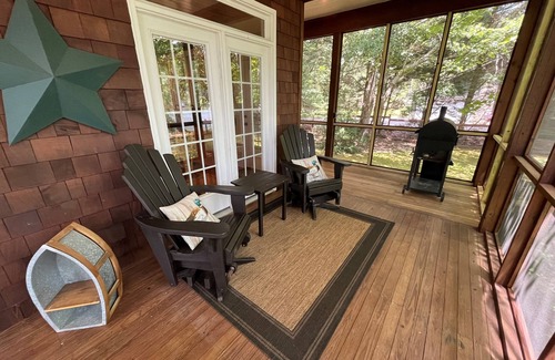 Our large FENCED-IN back lawn is perfect for running around playing tag, chasing fireflies, roasting marshmallows in the in-ground fire-pit or squaring off in a game of Giant Jenga, Horseshoes or Corn Hole (all provided!) under the shade of the Sycamore trees that border the lake. Relax on the wrap-around screened-in porch – where we bet you’ll spend the majority of your time – with unobstructed views of our boathouse and Lake Rabun. You and your guests can enjoy the peaceful calm of “The Narrows” and its no-wake zone, making swimming and water recreation worry-free. Explore the water via our 3-person, 17-foot canoe and 1-person, 15-foot kayak, or stay grounded and make use of our charcoal grill and the boathouse's lounge chairs, dining table and chairs and porch swing.