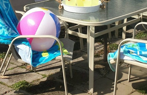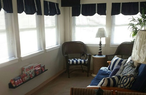 The cottage features ALL UPDATED MATTRESSES IN BEDROOMS queen size bed in the Master bedroom and in the second bedroom with a twin sleeper sofa, the sun room is also used as a third bedroom with a queen size futon and the living room has a queen size sleeper sofa. The kitchen comes fully equipped with dishes, cups and silverware. The laundry room has a full size washer and dryer for your convenience. There are plenty of places to enjoy your meals with an eat in kitchen, sunroom, a picnic table on the front covered porch and backyard patio dining area where you can also grill all the family’s favorites on the gas grill. Later, enjoy the evening making smores sitting around the campfire ring under the stars. And for those warm summer nights cottage is equipped with air conditioning.