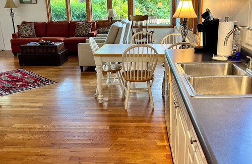 I just reduced the daily rate and have only one week available in September. This is a great deal for a premier vacation property in Waynesville. Picture yourself on the deck listening to the creek as you take in the views of your mountain cabin getaway. This charming Waynesville cabin has 2 bedrooms and 1 1/2 bathrooms with hardwood floors throughout. The 18 large cathedral windows in the family room and kitchen provide beautiful scenic views day and night. The home is complimented by 400 square feet of outside deck, a hot tub, and gas firepit all overlooking the Blue Ridge Parkway and the Waynesville valley. The property is nestled in the trees at 3,800’ elevation with abundant privacy and cool breezes year round. The road to the cabin is paved and maintained by the state. You won’t need a 4 wheel drive vehicle to get here. The cabin has an 8’ fireplace with gas logs, central heat and air, new kitchen appliances, a gas grill, washer and dryer, cable TV in the living room and both bedrooms and fast WiFi. Only 10 minutes to the Blue Ridge Parkway and famous Barbers Orchard and downtown Waynesville is less 15 minutes away from this quiet and private cabin. Your mountain escape offers plenty of opportunity for a relaxing, dare I say romantic, getaway in the beautiful Smokey mountains. Somebody is going to grab this last week in September fast. Will it be you?