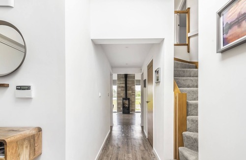 This luxury lodge is contemporary in style, and light filled throughout, with a spacious open-plan kitchen, dining and sitting area with a modern wood burning stove. Large double sliding doors lead out to the deck, the hot tub and lakeside grounds, teaming with wildlife. The beautifully furnished accommodation provides flexible living with two ground floor double bedrooms with en-suite shower rooms, and on the first floor is a twin children’s bedroom and a colourful den and playroom with day bed, both off a bright landing with a desk/study area.