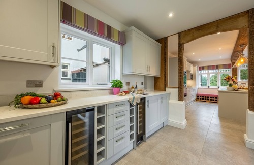 Once one of five farmhouses which served the estate during the 19th century, today this impressive, three-storey, timber framed building has been transformed into an exceptional holiday home with exquisite attention to detail at every turn. Expertly designed interiors by The Design Consultancy (and featured in both 25 Beautiful Homes February 2024 and the Design section of Good Housekeeping Magazine May 2023) blend seamlessly with the property's abundance of characterful features. Guests can spread out or gather together and enjoy the seemingly endless reception rooms both inside and out. The light and airy drawing room with its roaring open fire, oak flooring from the estate woodland, and tasteful, comfortable furnishings boasts garden and parkland views; the charming dining room, with more estate views will more than do for those celebratory dinners in front of an feature electric wood burning stove for extra ambience. The kitchen will satisfy even the keenest of chefs with a large induction hob, double ovens, two dishwashers, wine fridges, Nespresso coffee machine, Belfast sink, breakfast bar and cosy underfloor heating; with the washing machine and tumble dryer neatly out of the way in the utility room along with double Belfast sinks, an American style fridge freezer and under-counter freezer (in addition to a large larder fridge in the kitchen). When it's time for some entertainment, choose from hunkering down in the snug to enjoy the 55 inch Smart television; or head downstairs to the stunning movie themed cinema room where you can immerse yourselves in a blockbuster via the wall mounted 75 inch 4k Smart television including Sky Sports. The snug provides a comfy sofa bed and is located next to a spacious wet room, ideal if anyone in the group requires ground floor sleeping accommodation. If you need to catch up on some emails, a useful study area is provided along with a house safe.