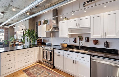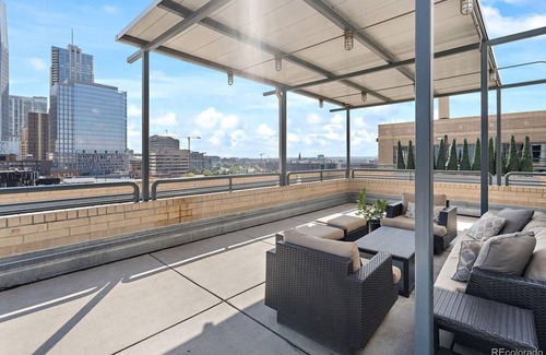 Located in the heart of LoDo, this modern and sophisticated loft has spectacular city views. The spacious, open floor plan makes entertaining easy with functional living spaces that blend together seamlessly. Light filled rooms, smooth concrete ceiling, and hardwood floors add to the inviting feel. The kitchen and bathroom are recently updated, and the bathroom includes a steam shower. 1 garage parking space and a personal storage unit are also included. Palace Lofts is a desirable building with amenities that include a 24-hour doorman, work out facility, common area roof top terrace, and a conference room. Step outside your front door to enjoy a variety of dining, walkability to Ball Arena and Coors Field, 4 blocks to Union Station for Train to Plane access to DIA, Ski Train to Winter Park, nationally renowned performing arts, and so much more!