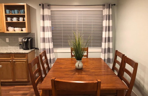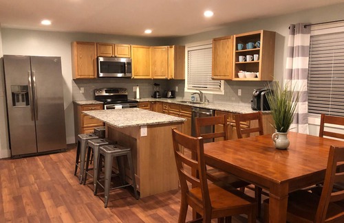 The kitchen is updated with new oak cabinets, granite countertops, and stainless steel appliances. It is stocked with dishes, flatware, cookware, and everything you will need to prepare you own meals. It has a Keurig and all the coffee you can drink. There is a table that seats 6 and an island that seats 4.