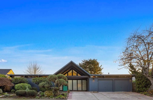 This Robert Rummer masterpiece celebrates mid-century design and A. Quincy Jones’ iconic “double gable.” Soak in natural light from the atrium, relax under vaulted ceilings, and retreat to your private hot tub where style and serenity meet. | House in Beaverton