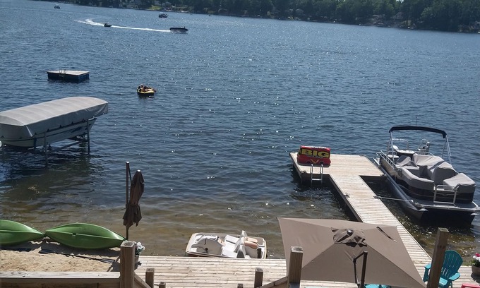 Step out onto the deck and enjoy the stunning view of the lake, surrounded by colorful trees in the fall. With direct access to the water, you can fish right off the dock or take our pontoon boat out for fishing or swimming. We also provide kayaks and a pedal boat for you to explore Turtle Cove, just two lots over, or simply relax on the beach.