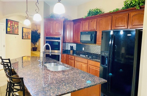 Fully equipped kitchen: granite countertops, kitchen island, breakfast bar, Keurig Coffee Maker and K-Cup Pods, spice rack, several cabinets, pantry, toaster, knife block, gas stove, microwave, double door fridge, two ovens, filter faucet, and large sink