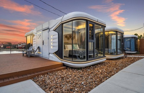 Welcome to Le Bateau, a one-of-a-kind tiny home designed for a unforgettable stay by the beautiful San Jacinto River. This charming abode boasts a sleek, all-aluminum alloy frame, offering both durability and modern aesthetics. With a stunning panorama window and a sun window, you'll be treated to breathtaking views of the river. Despite its compact size, it's equipped with all the comforts of home, a Cali King bed, a kitchen with cooktop and fan, and a bathroom with private shower room.