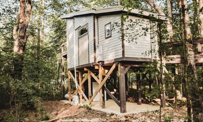 This unique place has a style all its own. You'll be so surprised at how much living space is in this tiny Treehouse. It has a loft bedroom with an outdoor deck for your morning coffee or evening cocktail. Downstairs off of the kitchen under the loft is the second bedroom and a full bath. The kitchen is fully stocked with everything you should need. to cook fabulous food.