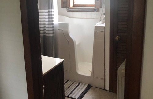 We have a utility with a washer and dryer. The bathroom has a walk-in tub with a hand-held shower.