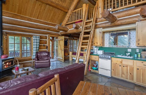 Immerse yourself in nature's embrace with breathtaking panoramic views from large windows and relaxing porches. Inside, a cozy fireplace invites you to unwind after a day of adventure. This unique backcountry retreat provides essential comforts, including solar power, running water, and internet access, allowing you to stay connected while feeling completely removed from the everyday.