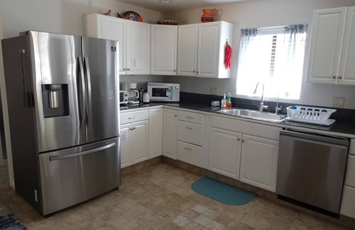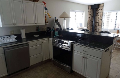 If dining in is your interest, the Ranch Bungalow provides a 4 burner electric range with oven for your indoor chef and a propane BBQ for your outdoor grill chief. There are some basic pots, pans, plates, cups, and utensils for your use. A dishwasher helps with clean-up, and please note that there is washer/dryer with this house across the patio.