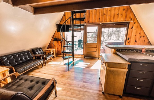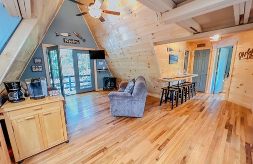 Nestled upon a private pond, enjoy the unique spaces and amenities provided by each of the three A-frames. Run about the entire property with fishing poles for catch and release fishing, visit each other around the fire pits, or star gaze while enjoying the hot tubs. Each cabin comes equipped with: