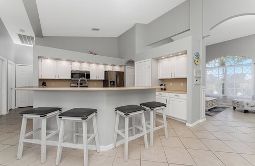 Recently renovated immaculate 3-bedroom/2-bathroom Bungalow in Rotonda West is amongst 5 Enjoyable Golf Courses and just a short drive to some of the Gulf's Best Beaches. This high ceiling open concept floor plan is bright and spacious, the perfect retreat for entertaining & relaxation. The Family Room (65" TV) has patio sliders which open to the kidney shaped pool. Fully stocked kitchen with ample seating at the breakfast bar or adjoining dining table. Separate living/sitting area offers a pull-out Queen bed. Split & private floorplan has the Master Bedroom at opposite sides of the house from the 2nd and 3rd bedrooms. The Master Bedroom (King bed, 50" TV) with private ensuite has a soaker tub, walk-in shower & conveniently opens up to the pool area. Two Guest Bedrooms: Queen bed (42” TV) & 2 Twin beds (50” TV). The Guest Bathroom has a tub/shower combo and opens to the backyard & canal area.