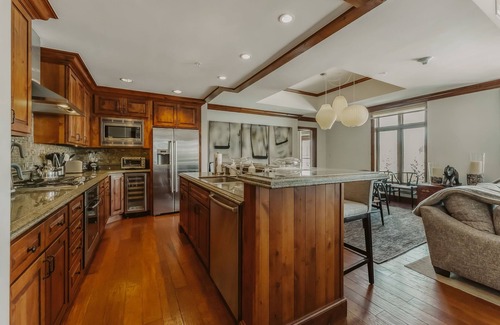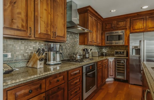 - Fully Equipped Kitchen: The warm ski lodge-style kitchen boasts stainless steel appliances and expansive stone countertops, making it easy to host pre-wedding brunches or intimate dinners.