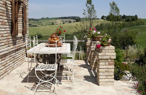 On the large terrace little tables and chairs provide ideal space for breakfast al aperto, where the eye can wander over fields of wheat or sunflowers and the numerous little medieval hamlets which surround the farmhouse.