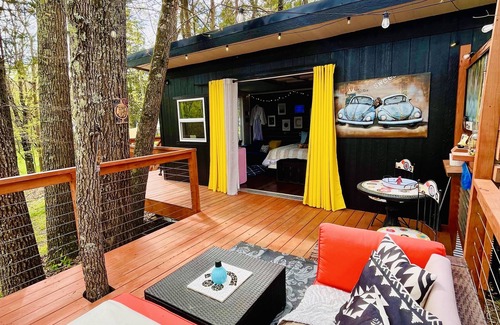 All 3 cabins are suitable for 2 adults and each unit has a queen bed. Units one and two have gorgeous soaking tubs and the third has a large walk in shower...we provide the robes! There are Keurigs and mini refrigerators and we provide plenty of KCups. We have installed quiet garage doors that open your bedroom/living spaces onto expansive decking, creating an open air vibe. Each unit has privacy walls for each deck space as well as private outdoor fire pits with outdoor furnishings (Adirondack chairs, hammocks, and swings are sprinkled all over the property). Just wait until you see this space at night!! Sparkling trees abound, italian lighting, murals on the buildings are lit, just so much fun!