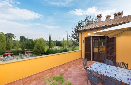 The apartment is in typical Tuscan style and equipped with every comfort, on the 50 sqm terrace overlooking the pool you have a private outdoor area with garden chairs and table, the windows are equipped with mosquito nets.
