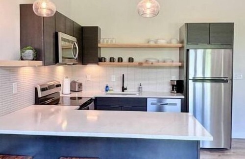 A fully equipped kitchen with modern appliances.