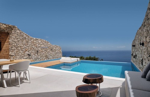 Villa Rufus offers a truly unique and luxurious experience, perched on the upper level of a hill as the island's first-ever cave accommodation. This stunning suite redefines cave dwelling with its exquisite modern design and lavish interior. The expansive open-plan living area is bathed in natural light, thanks to the enormous glass doors that seamlessly connect the indoors with the outdoors. Step out onto your private terrace, complete with an infinity pool, where you can immerse yourself in the tranquility of nature while enjoying breathtaking panoramic views of the sea.