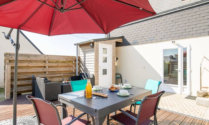 "Ti Bihan", 3-room house 35 m2 on 2 levels. Fully renovated in 2024, beautiful and cosy furnishings: living/dining room 20 m2 with Scandinavian wood stove and TV (flat screen). Exit to the terrace. Small kitchenette (2 gas rings, toaster, kettle, microwave, electric coffee machine, Capsules for coffee machine (Dolce Gusto) extra). Shower/WC. Upper floor: 1 room 9 m2, with sloping ceilings with 1 french bed (140 cm, length 190 cm). 1 room 9 m2, with sloping ceilings with 1 bed (90 cm, length 190 cm). Electric heating. Terrace 30 m2, south facing position. Terrace furniture, barbecue (portable), deck chairs (2), box-room. Facilities: washing machine, children's high chair, baby cot, hair dryer. Please note: non-smoking house. Smoke alarm. Offer by a private individual according to Art. 155, IV of CGI. 29185000158FU